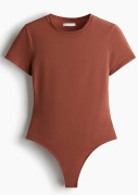 Body z mäkkého mikrovlákna s okrúhlym výstrihom a krátkymi rukávmi. Skryté patentné gombíky v rozkroku a vysoko vykrojený zadný diel.