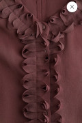 Blúzka z priesvitnej viskózovej krepovej tkaniny s nízkym stojačikom. Zapínanie na skryté gombíky zvýraznené naberanými volánikmi. Padnuté plecia a mimoriadne dlhé zvonové rukávy s rozparkami na manžetách. Zámiky na pleciach a v páse na zdôraznenie siluety. Jemný zúbkovaný okraj na manžetách aj naspodku.