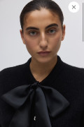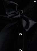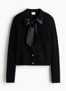 Sveter z mäkkého rebrovaného úpletu s okrúhlym výstrihom s veľkou saténovou mašľou vpredu. Zapínanie na gombíky, mierne padnuté plecia a dlhé rukávy.