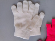 Dievčenské pletené rukavice - biele / krémové minimálne nosené, ružové metalízové. Obe F&F, Uni detská veľkosť, no najlepšie sedia na 5-8 rokov. Žiarivé ružové - bezprsté sú Disney, s potlačou Minnie.