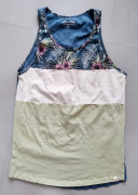 Pánske / chalanské tielko, bavlnené, ľahké, tenké. Kupované v Decathlone za 18€. Je to taký uvoľnený plážový vzhľad. Zadný diel modrý, predný kvety - smotanový pás - zelený pás.