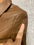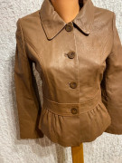 pravá koža, peplum strih, gombíkové zapínanie,podšitá. mals som ju asi 2x je ako nová, ale na ramene má trošku zosvetlenú farbu asi ako 2 špendlíkové hlavičky. neviem z čoho. 45 39