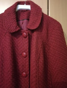 Super dámsky kabát tmavočervenej farby, podšitý, okrúhly golier, efektné veľké gombíky, vrecká, šírka pod pazuchami 62 cm, celková dlžka 83 cm, dobrý stav