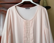 Dámska blúzkabledoružovej farby, 3/4 rukáv, vpredu krajka, spodok ukončený gumičkou, šírka pod pazuchami 60 cm, celková dlžka 65 cm, super stav