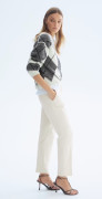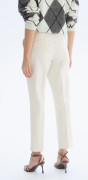 Cigaretové kalhoty z elastické tkaniny. Jsou dlouhé ke kotníkům. Mají klasický pas se skrytou gumou, poklopec na zip se skrytým zapínáním na háček, postranní kapsy a falešné zadní kapsy. Nohavice se zužují.