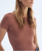 Body z měkkého mikrovlákna. Má kulatý výstřih, krátké rukávy, skryté druky v rozkroku a vysoce střižený zadní díl.
