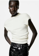 Top s krátkym rukávom z jemného úpletu zo zmesi viskózy. Nízky stojačik, vyhrnutý lem okolo manžiet a zámiky na jednej strane pása pre jemne splývavý efekt.