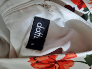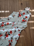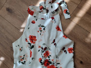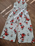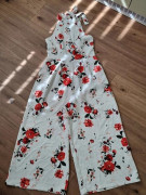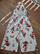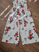 Draží sa kvetinový nohavicový overal veľ. 40, 1x pouzity..krasny..neelasticky..americke prieramky,culotte nohavice 7/8dlzky podsite podsivkou v casti ako kratasy. Ale latka nepresvita.celkova dlzka od ramien 132 cm...od podpaxusia 105 cm...prsia 48x2..pas 40x2...sirka nohavic dole 37x2 cm