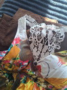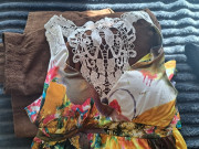 Krasne padave dlhe saty...vhodne na horuce letne dni ...je to chladivy material .... vzadu na chrbte zabkovanie . Su ako nove ...a krasna cipka prsia maju vsite vypchavky ....pestre farby ...elasticky material....dlzka 150cm ...sirka prsia 2x47 cm v klude