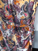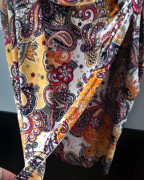 Pekné dámske šaty s potlačou, super zladené farby, na boku mierne riasenie, ozdobná pracka s opaskom, bočný rozparok, príjemný pružný materiál, šírka pod pazuchami 52-55 cm, celková dlžka 108 cm, oblečené 2x bez poškodenia ako nové, kupované v butiku, veľkosť písaná 48, ale zodpovedá veľ.44-46